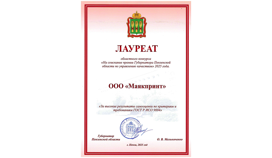 ООО «Маякпринт» — Лауреат Областного конкурса «На соискание премии губернатора Пензенской области по управлению качеством»